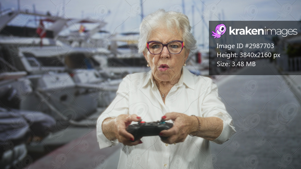 Senior woman holding gamepad with both hands pointed forward on a marina pier, smiling and reacting as she plays; playful joy.