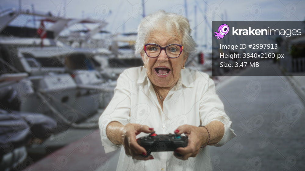 Senior woman holding gamepad with both hands pointed forward on a marina pier, smiling and reacting as she plays; playful joy.
