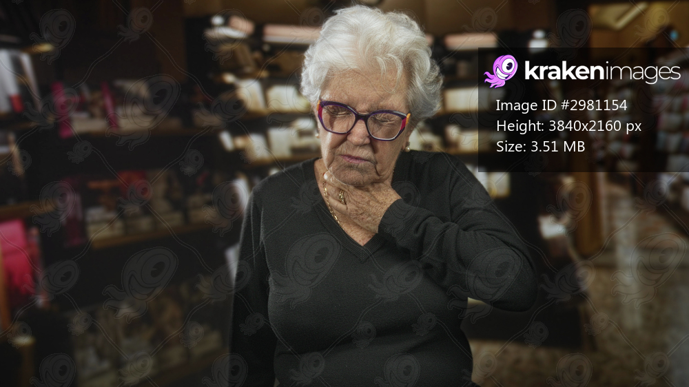 Senior woman holding hand to throat and grimacing among pharmacy shelves and product aisles in a store interior; anxiety concern.