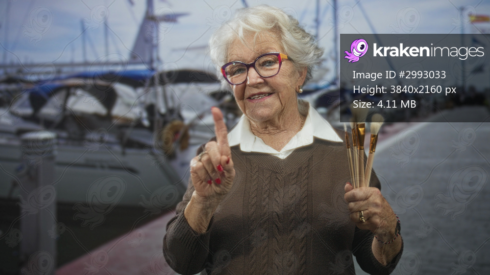 Senior woman holding paintbrushes points index finger toward the viewer while standing on a marina dock beside moored yachts; confidence.