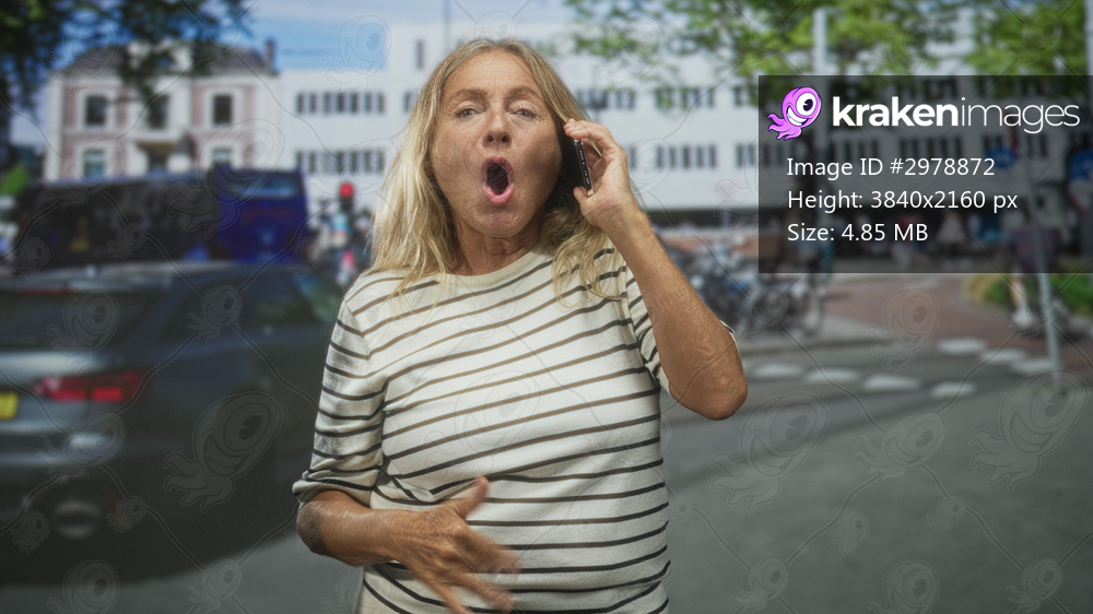 Senior woman holding phone to ear, hand on forehead and expressive open mouth gesture on urban street with cars and bicycles; surprise.