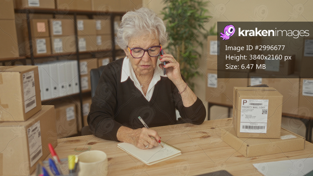 Senior woman holding phone to ear and writing on notepad amid stacked shipping boxes in a small business building; planning focus.