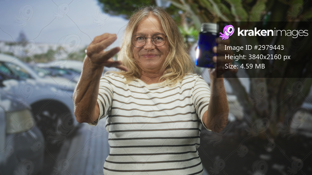 Senior woman holding pill bottle with open hand gesture in a street parking lot by cars and trees; calm wellness.