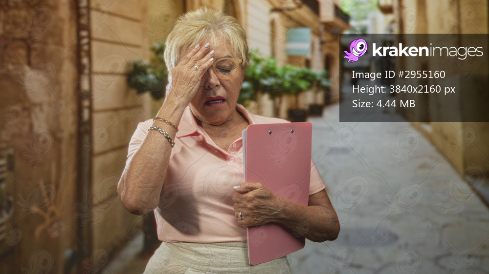 Senior woman holding pink clipboard with hand to forehead for headache in narrow street; stress worry.