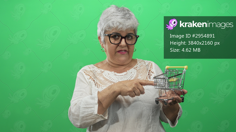 Senior woman holding and pointing finger at miniature shopping cart in studio; consumer decision curiosity.