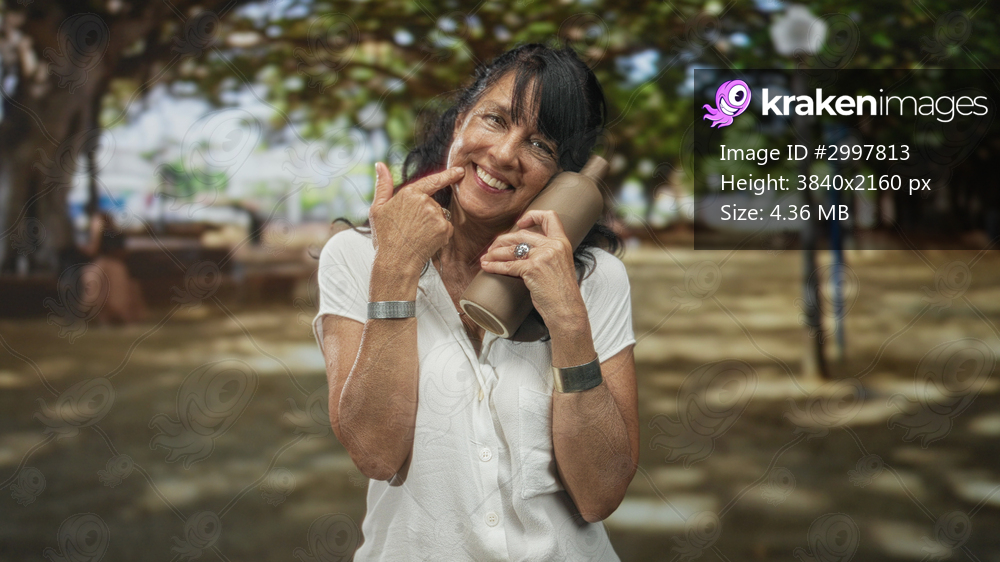 Senior woman holding pottery bottle and pointing finger to cheek while smiling in street; nostalgia connection joy.