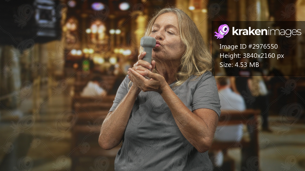 Senior woman holding small gray dumbbell with cupped hands while smiling in a church interior with wooden pews and warm lamps; serenity affection.