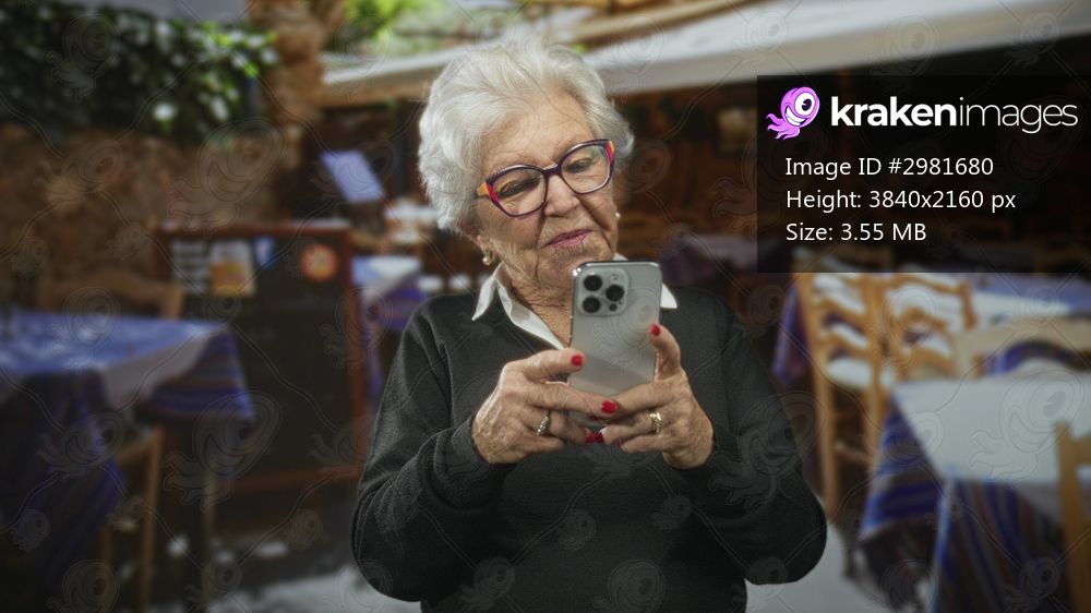 Senior woman holding smartphone with both hands taps screen and smiles in a street cafe; family connection joy.