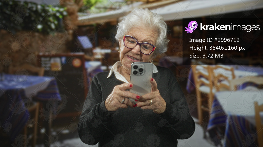 Senior woman holding smartphone with both hands taps screen and smiles in a street cafe; family connection joy.