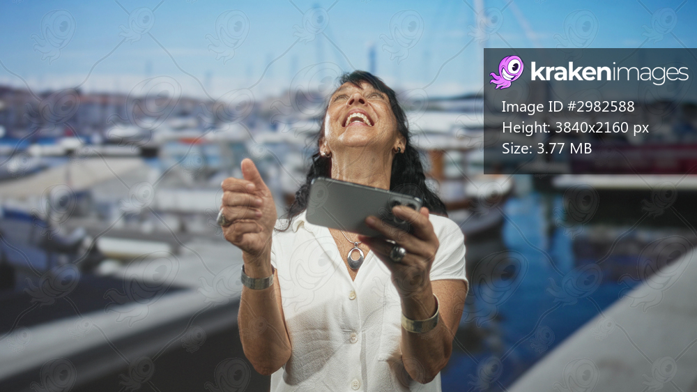 Senior woman holding smartphone, fist pump gesture on a marina street pier by yachts and water, smiling broadly in daylight; joy celebration.