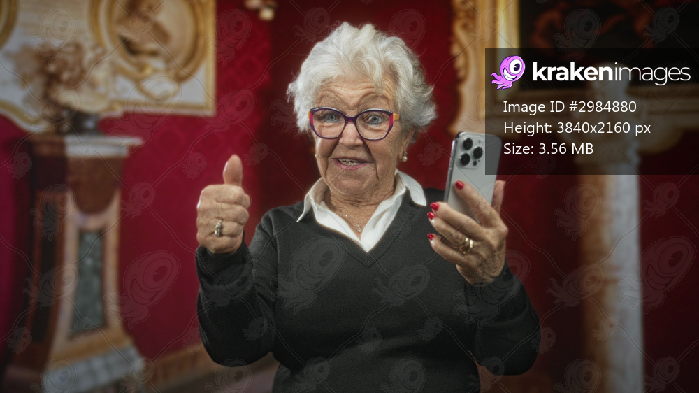 Senior woman holding smartphone and giving thumbs up in ornate building interior with marble column and framed art; joy connection.
