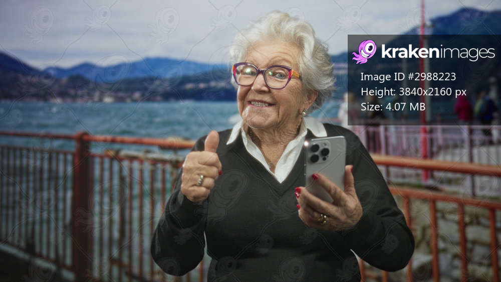 Senior woman holding smartphone and giving thumbs up on a street pier by a lake, wearing colorful glasses and rings, smiling at camera; digital connection joy. - Kraken Images