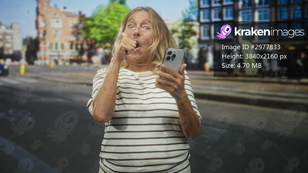 Senior woman holding smartphone and tapping screen on busy street while smiling, gesturing with finger, and checking messages; joy connection.
