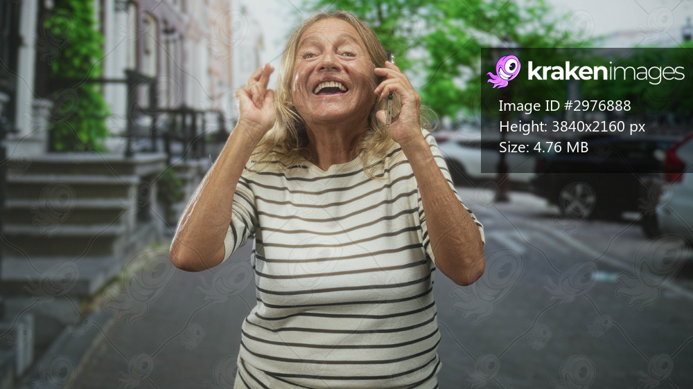 Senior woman holding smartphone to ear with fingers near ear and smiling, eyes closed, wearing striped shirt on a street with parked cars; joy connection. - Kraken Images