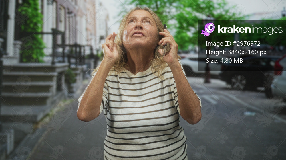 Senior woman holding smartphone to ear with fingers near ear and smiling, eyes closed, wearing striped shirt on a street with parked cars; joy connection. - Kraken Images