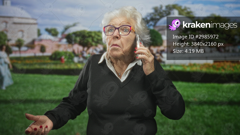 Senior woman holding smartphone to ear with palm up questioning gesture in front of a historic domed building and public park lawn; confusion.