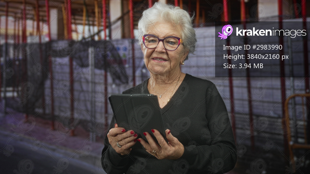 Senior woman holding tablet with hands tapping touchscreen on a street with scaffolding and building; gentle curiosity contentment.