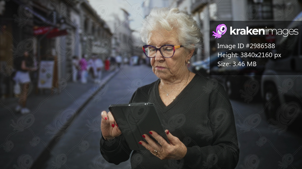 Senior woman holding tablet, tapping touchscreen with fingers on a busy city street during daytime; quiet concentration.