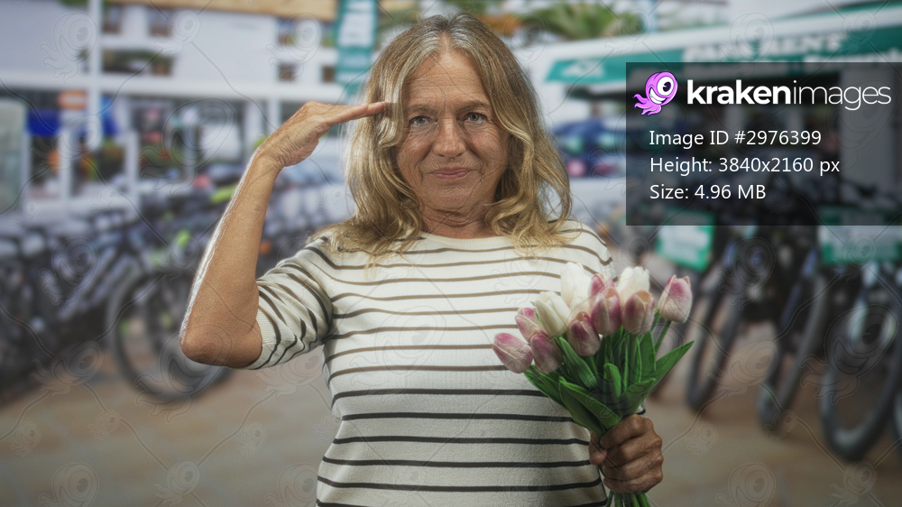 Senior woman holding tulips salutes on street by bike rental with rows of bicycles and a striped top; greeting celebration joy.