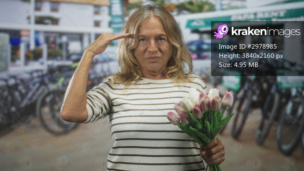 Senior woman holding tulips salutes on street by bike rental with rows of bicycles and a striped top; greeting celebration joy.