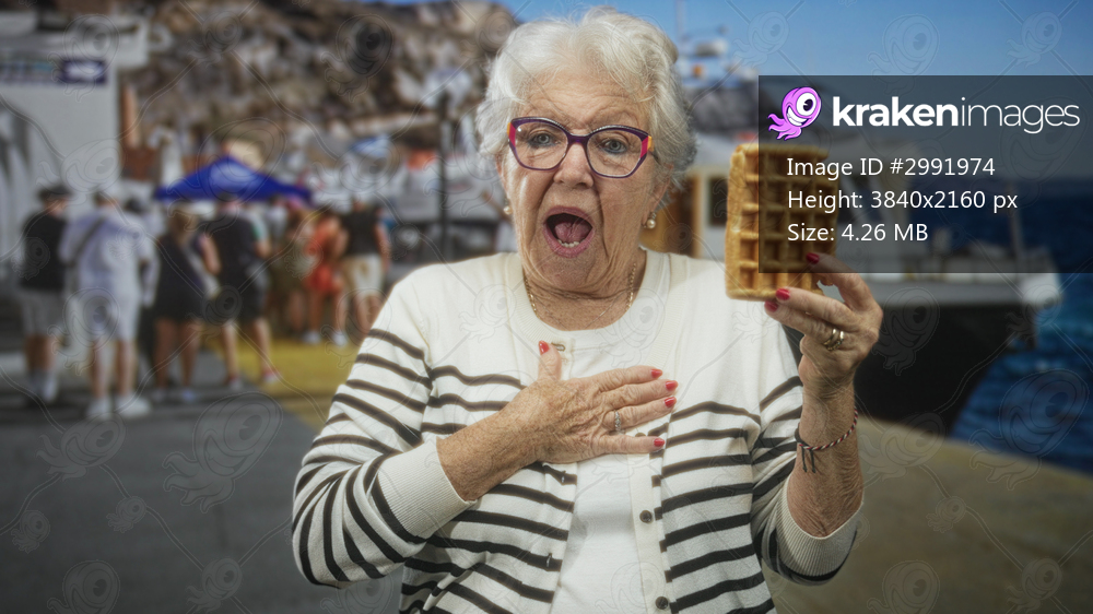 Senior woman holding waffle, hand on chest, wearing striped cardigan and glasses at pier by a marina with yacht and crowd; surprise nostalgia.