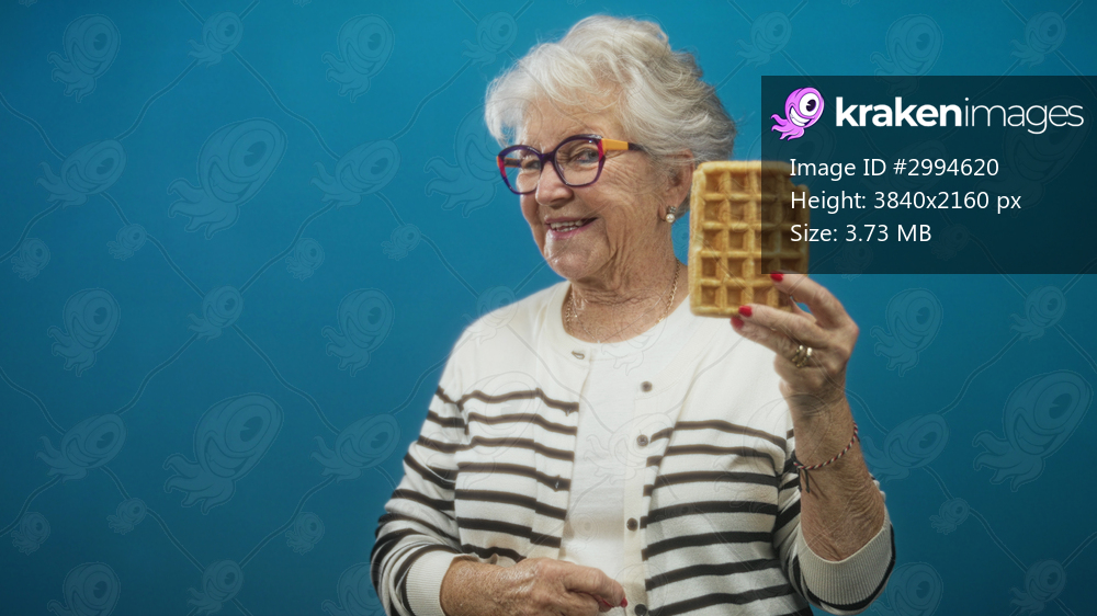 Senior woman holding waffle in right hand, smiling and pointing while wearing striped cardigan and colorful glasses in studio with blue backdrop; playful joy. - Kraken Images
