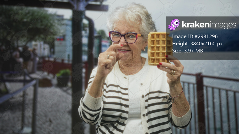 Senior woman holding waffle pinches fingers near face on a lakeside pier promenade by railing and water; playful nostalgia.