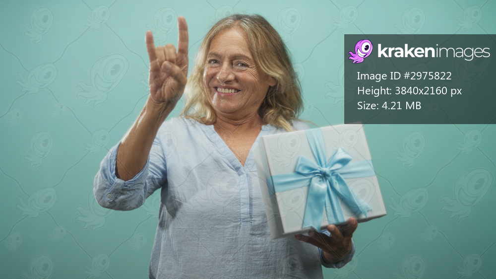 Senior woman holding white gift box with blue bow and flashing rock hand sign toward camera in studio; celebration joy.
