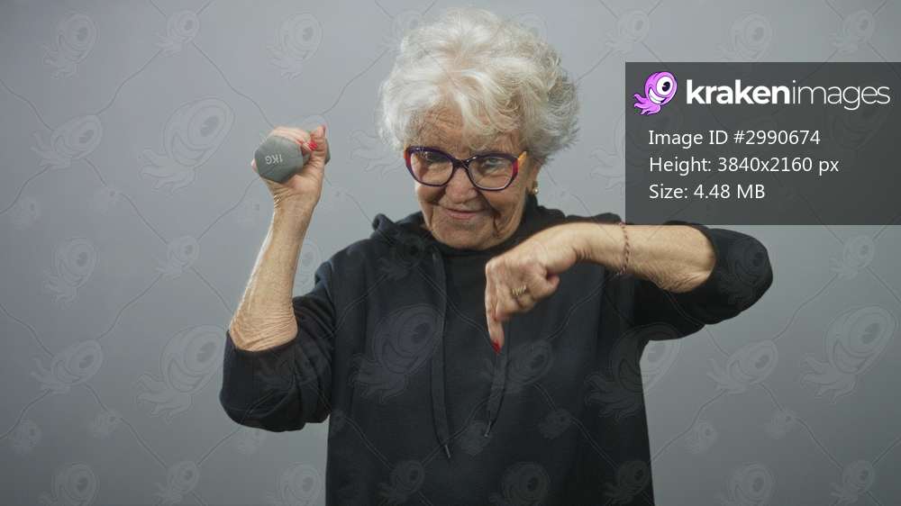 Senior woman holds 1kg dumbbell in her right hand and points index finger down with left, wearing glasses and a black hoodie in a studio; empowerment.