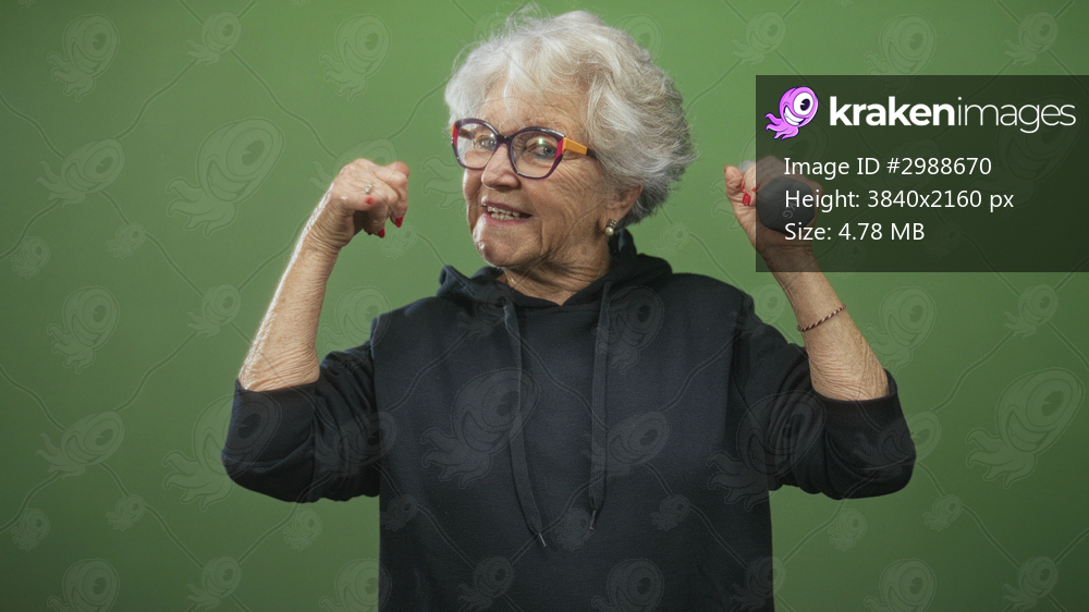 Senior woman holds a 1kg dumbbell and flexes her arm in studio with a green backdrop, smiling and pointing finger; confidence vitality.