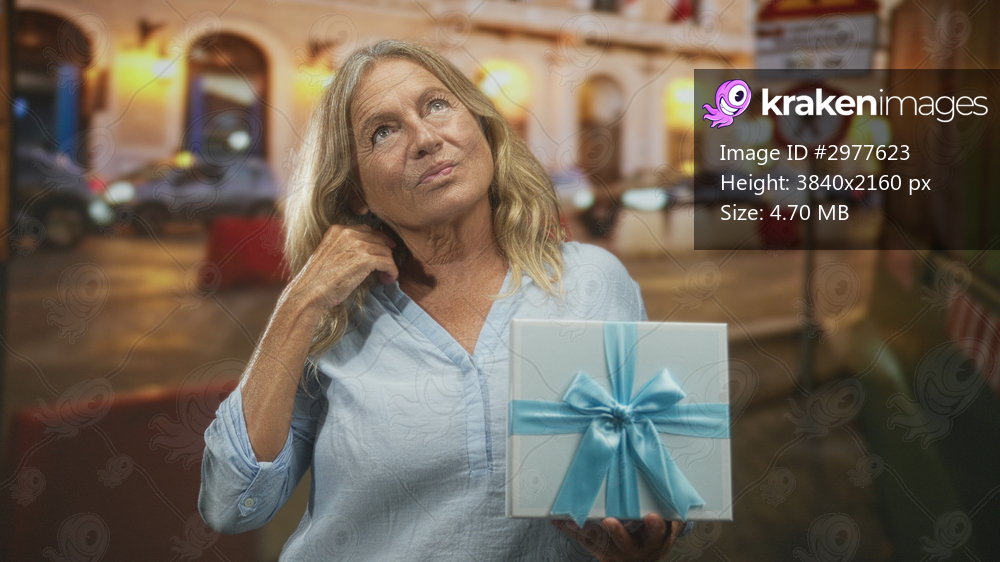 Senior woman holds a gift box with blue bow and touches her hair on a city street at night; quiet contentment.