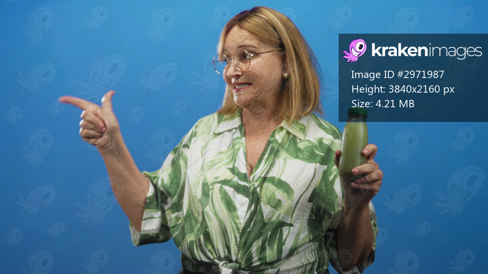 Senior woman holds a green juice bottle and points finger to side with smiling expression in studio; cheerful health promotion.