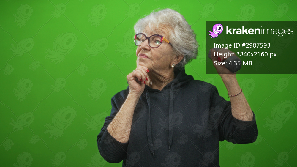 Senior woman holds dumbbell in right hand and rests chin on left hand in studio; confidence strength wellbeing.