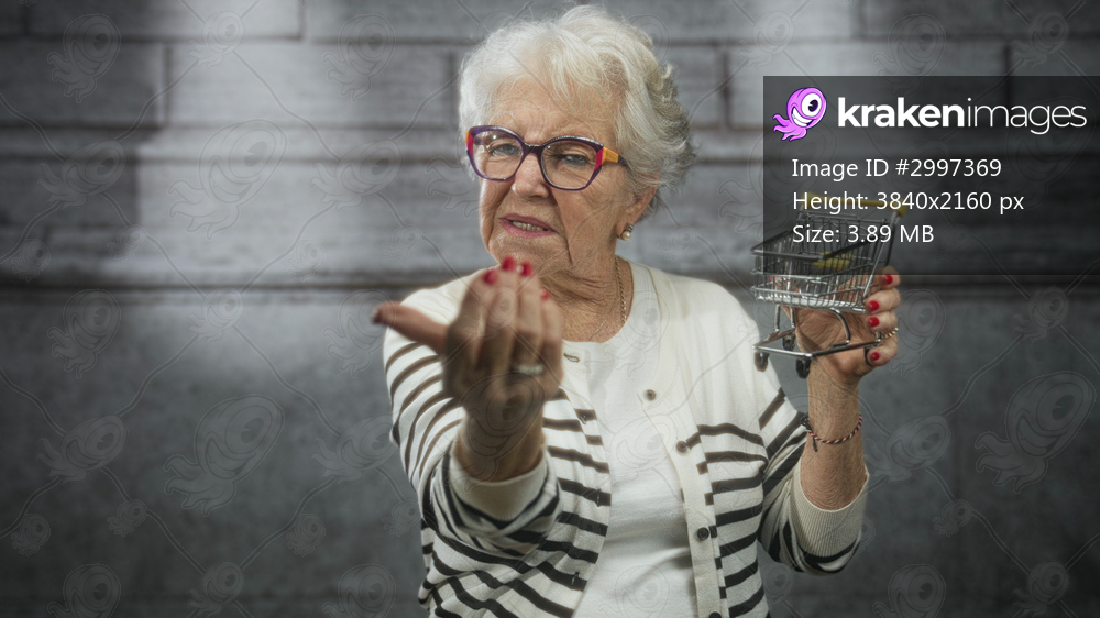Senior woman holds miniature shopping cart, points finger forward with outstretched hand in building; quiet determination.