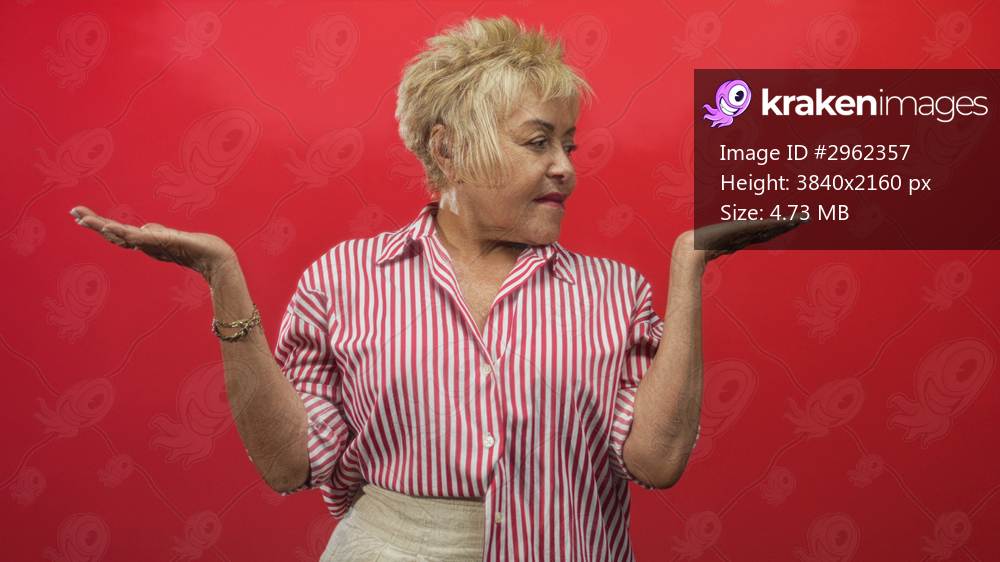 Senior woman holds palms up in a red studio, striped shirt and bracelet visible; quiet contemplation.
