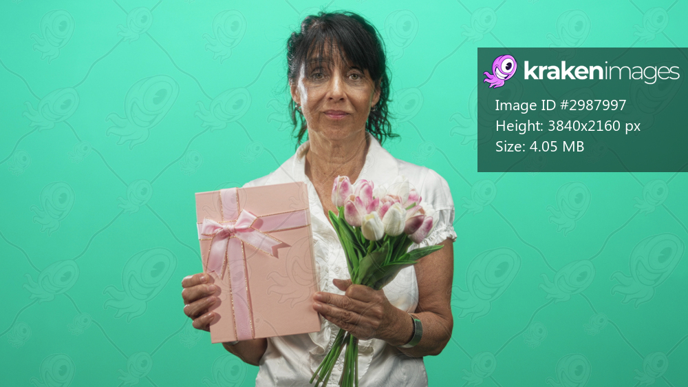 Senior woman holds pink gift box and bouquet of tulips with hands presenting, slight smile, green studio backdrop; gratitude celebration warmth.