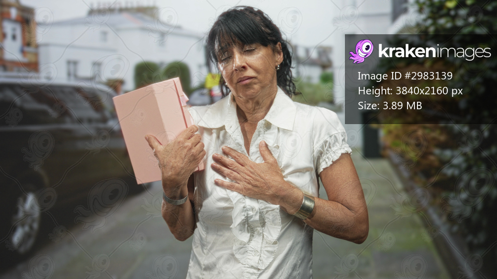 Senior woman holds pink gift box close, hand pressed to chest in thankful gesture on quiet residential street; gratitude reflection.