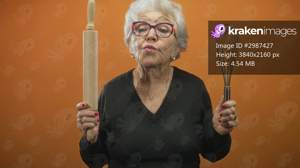 Senior woman holds rolling pin and whisk, lips pursed against orange backdrop in studio; home cooking playful.