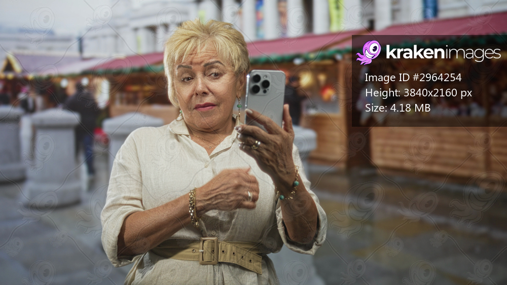 Senior woman holds smartphone and touches necklace and chest with hand at street market stalls; quiet contemplation.