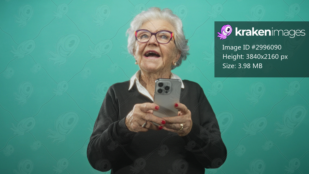 Senior woman holds smartphone with visible hands, mouth open and looking up in a studio; joyful curiosity.
