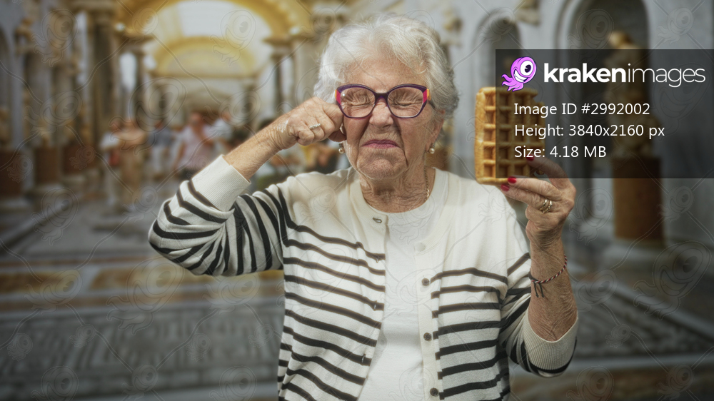 Senior woman holds waffle in right hand and presses finger to eye in ornate marble building corridor, wearing striped cardigan and purple glasses; playful defiance. - Kraken Images