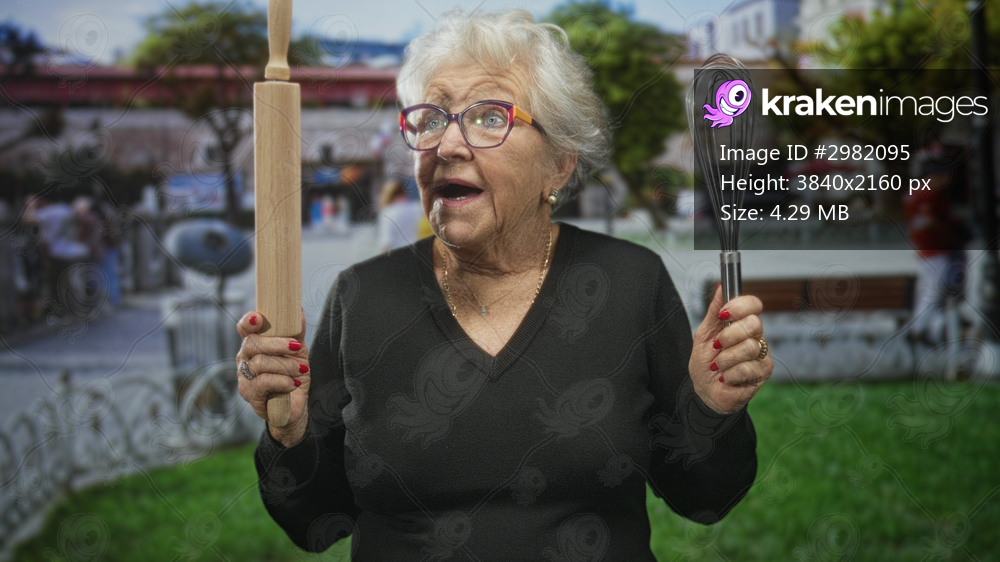 Senior woman holds wooden rolling pin in left hand and metal whisk in right while smiling and looking upward in street plaza; grandmother joy.