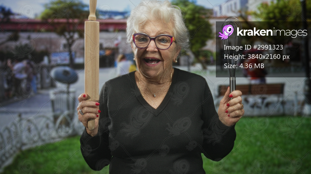 Senior woman holds wooden rolling pin in left hand and metal whisk in right while smiling and looking upward in street plaza; grandmother joy.