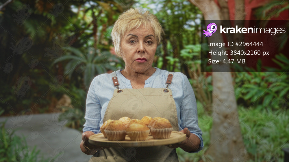 Senior woman holds wooden tray of muffins, hands visible and apron worn, set in building courtyard with plants and pathway; warm hospitality.