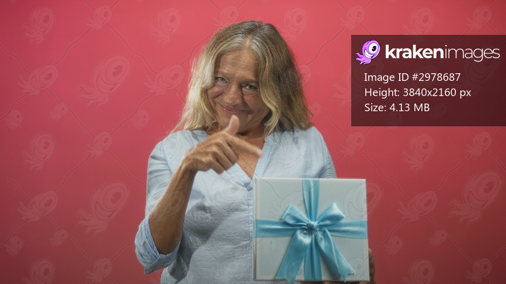 Senior woman holds wrapped gift box with blue ribbon and points finger at camera in studio; playful confidence.