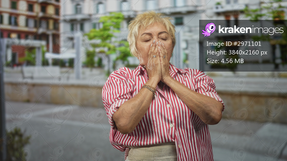 Senior woman in a striped shirt clasping hands near her mouth on a city street plaza, shifting from surprise to a smile; relief gratitude hope.