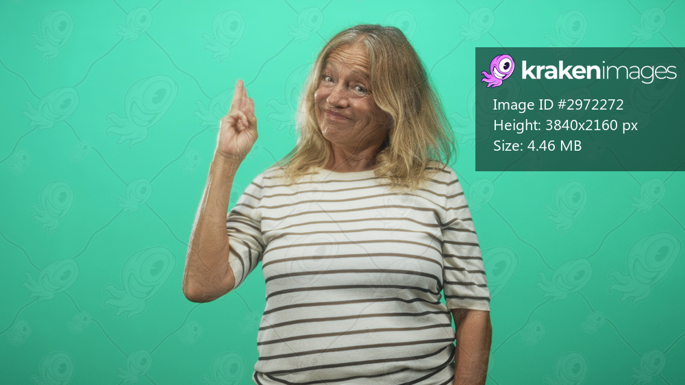 Senior woman in a striped shirt holding up fingers and smiling with raised hand in a studio green backdrop; optimism.