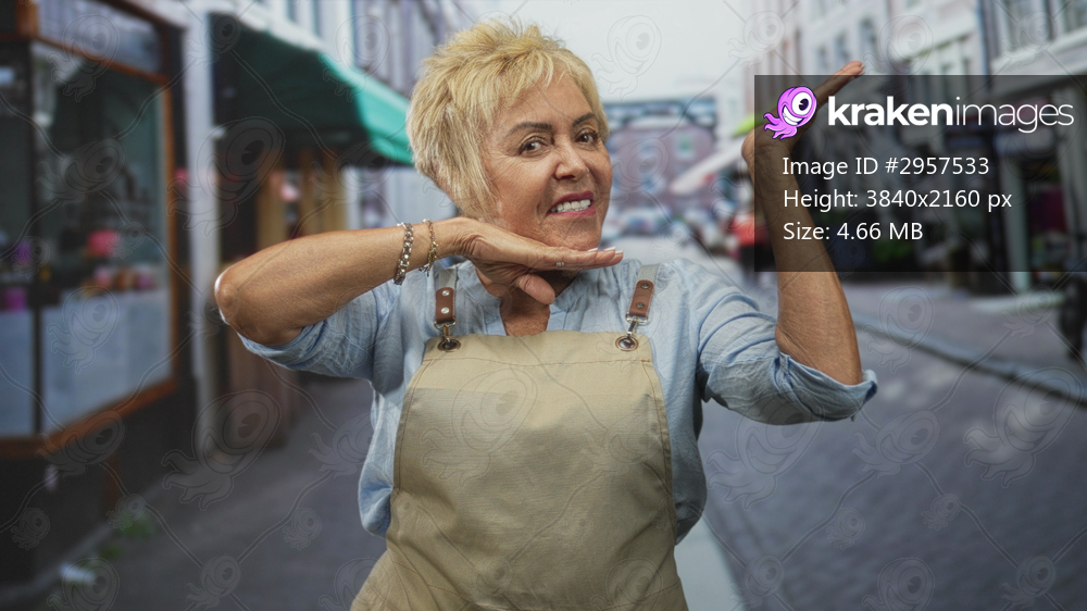 Senior woman in apron presenting with one hand under chin and other palm up on a pedestrian market street; cheerful confidence.
