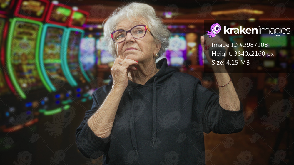 Senior woman in black hoodie holds 1kg dumbbell aloft with hand on chin amid slot machines in a casino; contemplation fitness.