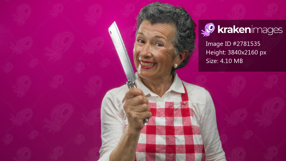 Senior woman in checkered apron smiling with knife in hand against vibrant pink background, exuding joyful cooking experience.